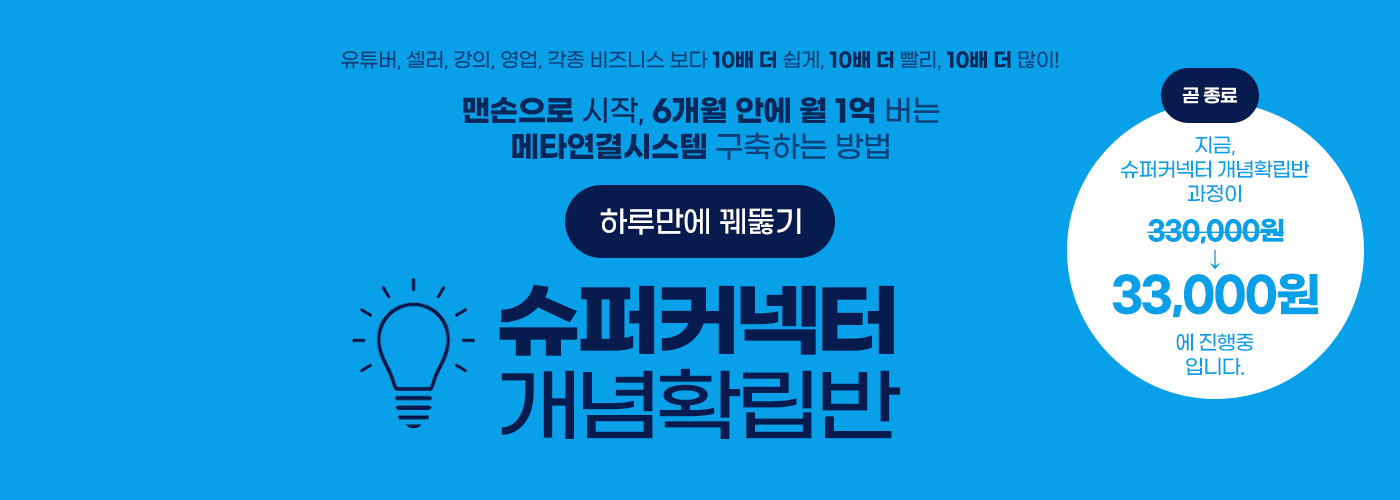 맨손으로 시작, 6개월 안에 월 1억 버는 메타연결시스템 구축하는 방법, 하루만에 꿰뚫기 과정인 '슈퍼커넥터 개념확립반'을 현재 90% 할인된 가격인 33만원 → 3만 3천원에 참여가 가능합니다.
